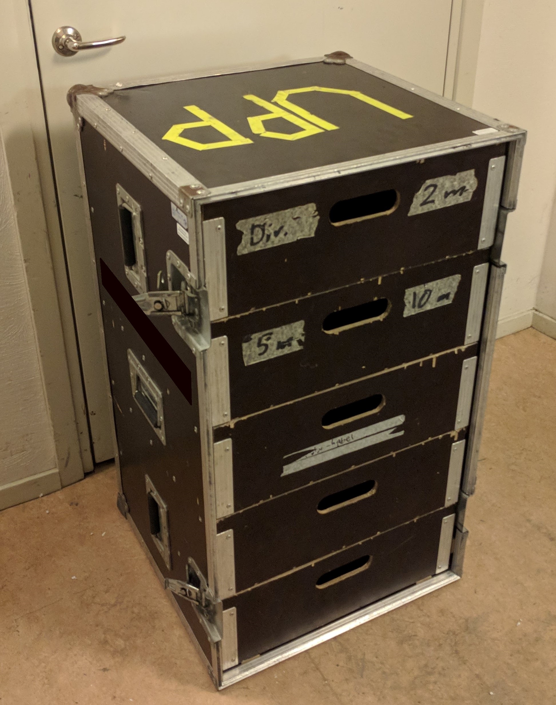 Övrigt: locket har lossnat på en låda, men finns kvar. Lådorna glider på skenor (inga gejdrar) utan ändstopp och är uttagbara.