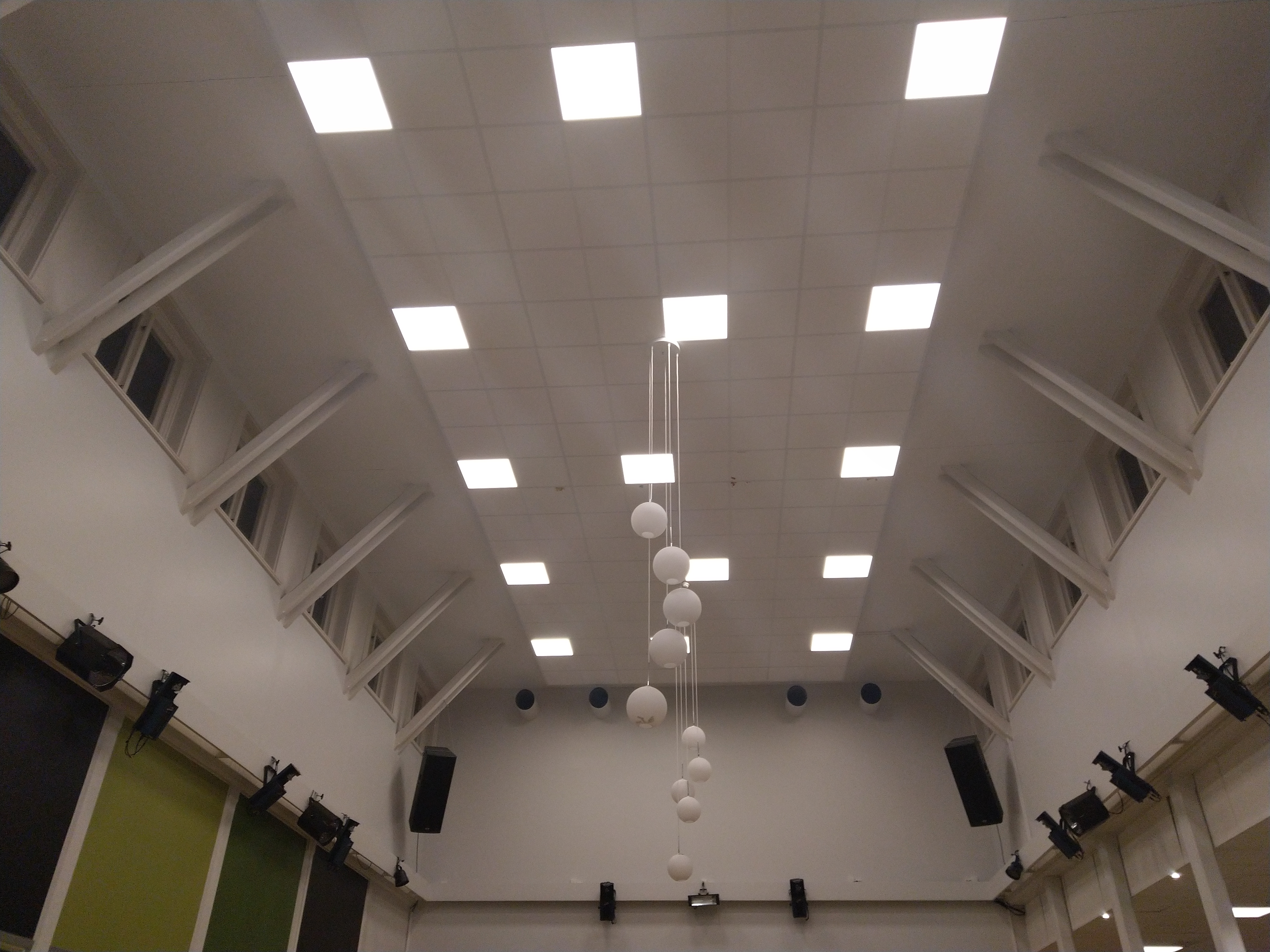 Skiss: Bilder: Min bästa idé just nu är att ha ett nät av stålvajrar (se bilden) som man hissar upp med hjälp av kullagerblock monterade i de existerande öglorna och som man draperar moltontyg eller liknande över (med hål för lamporna). Mellan kvällarna viker man ihop tyget men låter vajernätet sitta kvar. En ytterligare aspekt jag funderar på hur det är med säkerheten. Såklart väljer man ett flammskyddsbehandlat tyg, men är det något mer man bör tänka på?