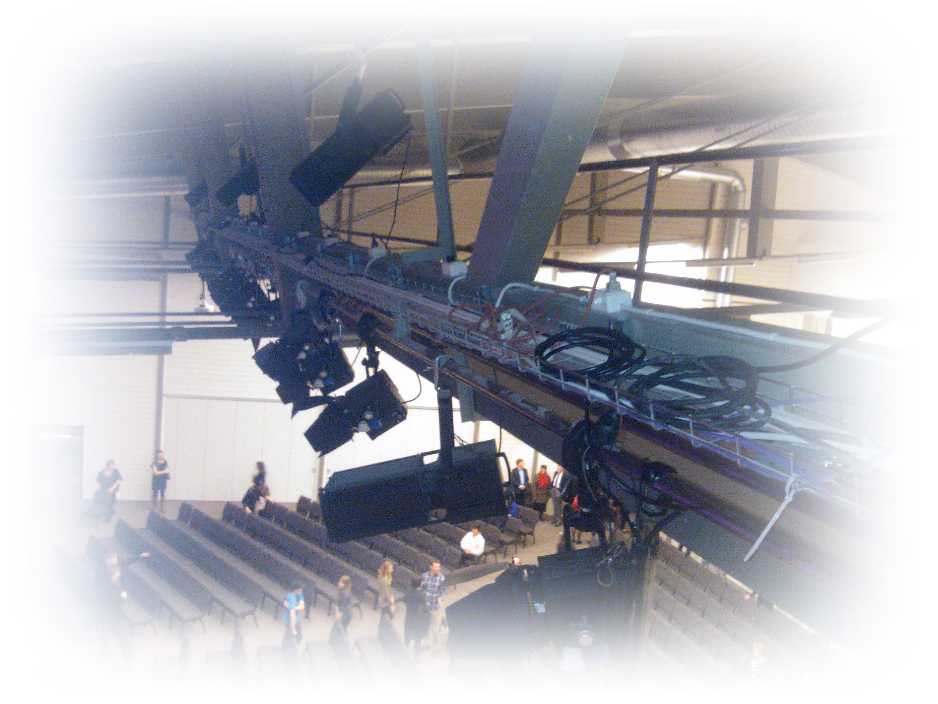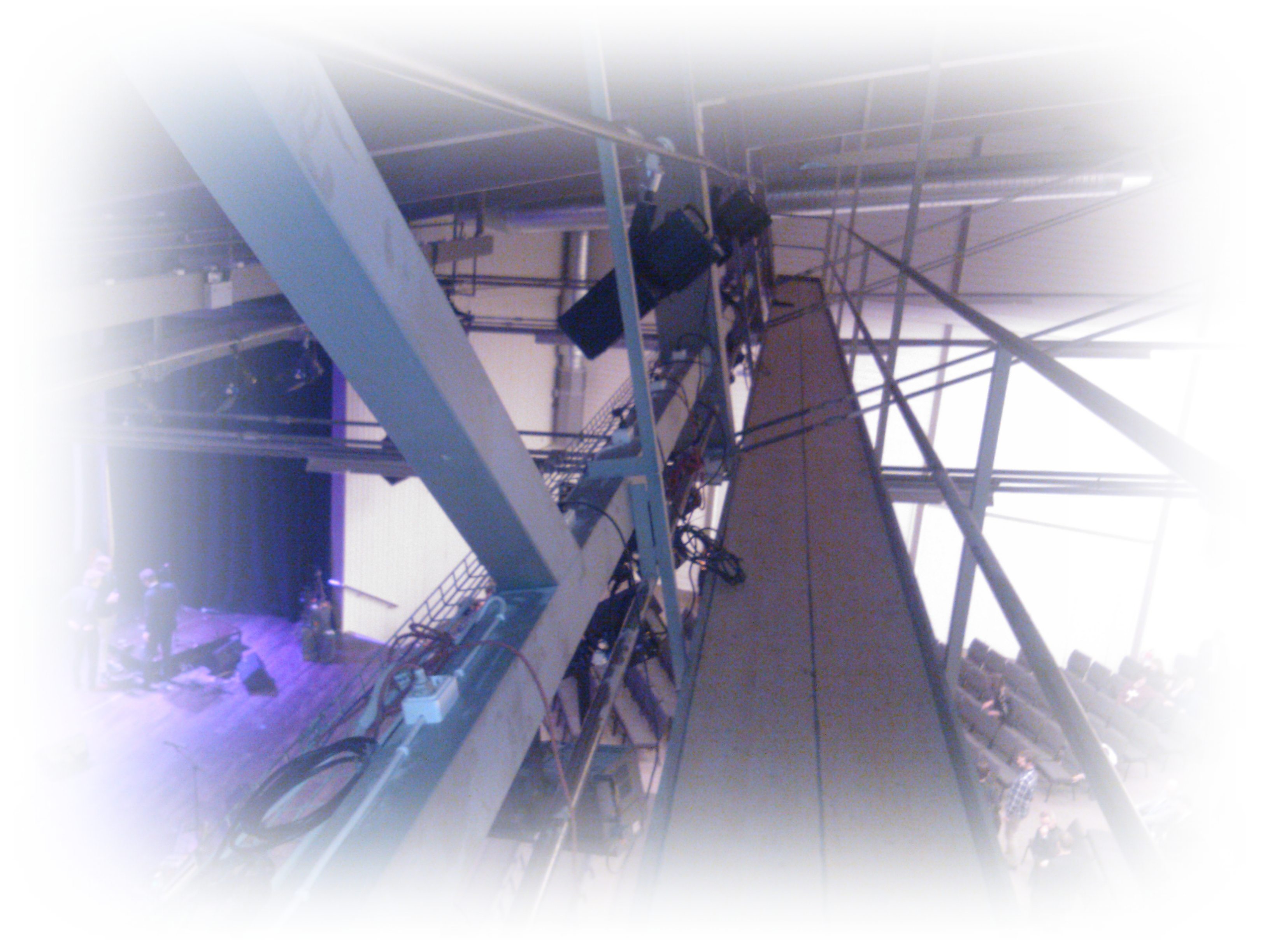 Vi har satt upp en landgång uppe vid rå´t för front ljus, så nu behöver man inte klättra så mycket för att rikta armaturerna. En enkel trapp upp. Det finns även en landgång över framkanten på scenen. smidigt och bra. Vi ska även skaffa tross till bakkant på scen som bör höjas å sänkas med ett par motorer.