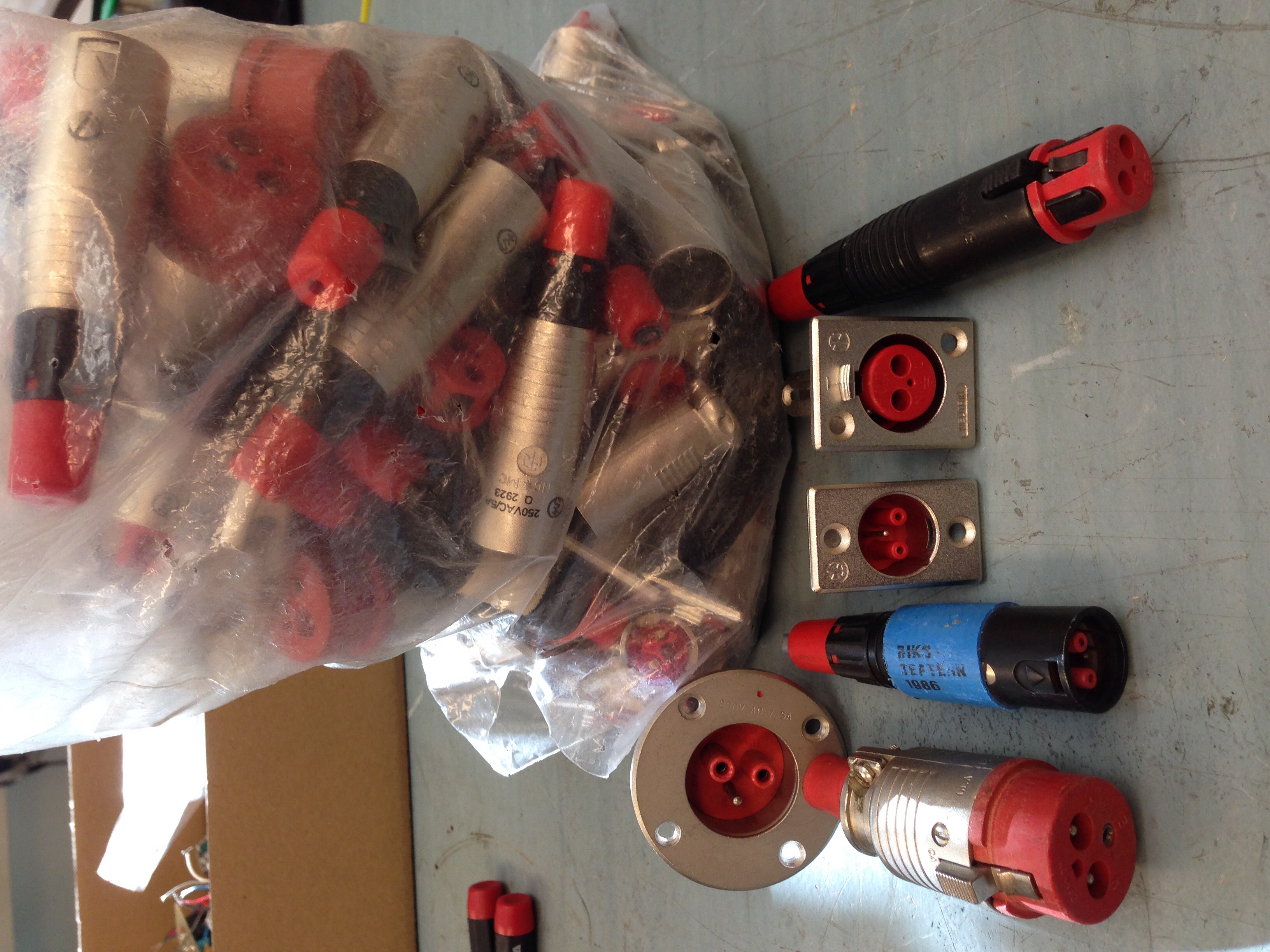 -XLR-LNE. Starkströmskontakter från Neutrik, 250V/5A. En påse med blandade chassi, sladd, hane, och hona. Dessutom några Cannon EP starkströmskontakter 250V/10A se bild. 200kr