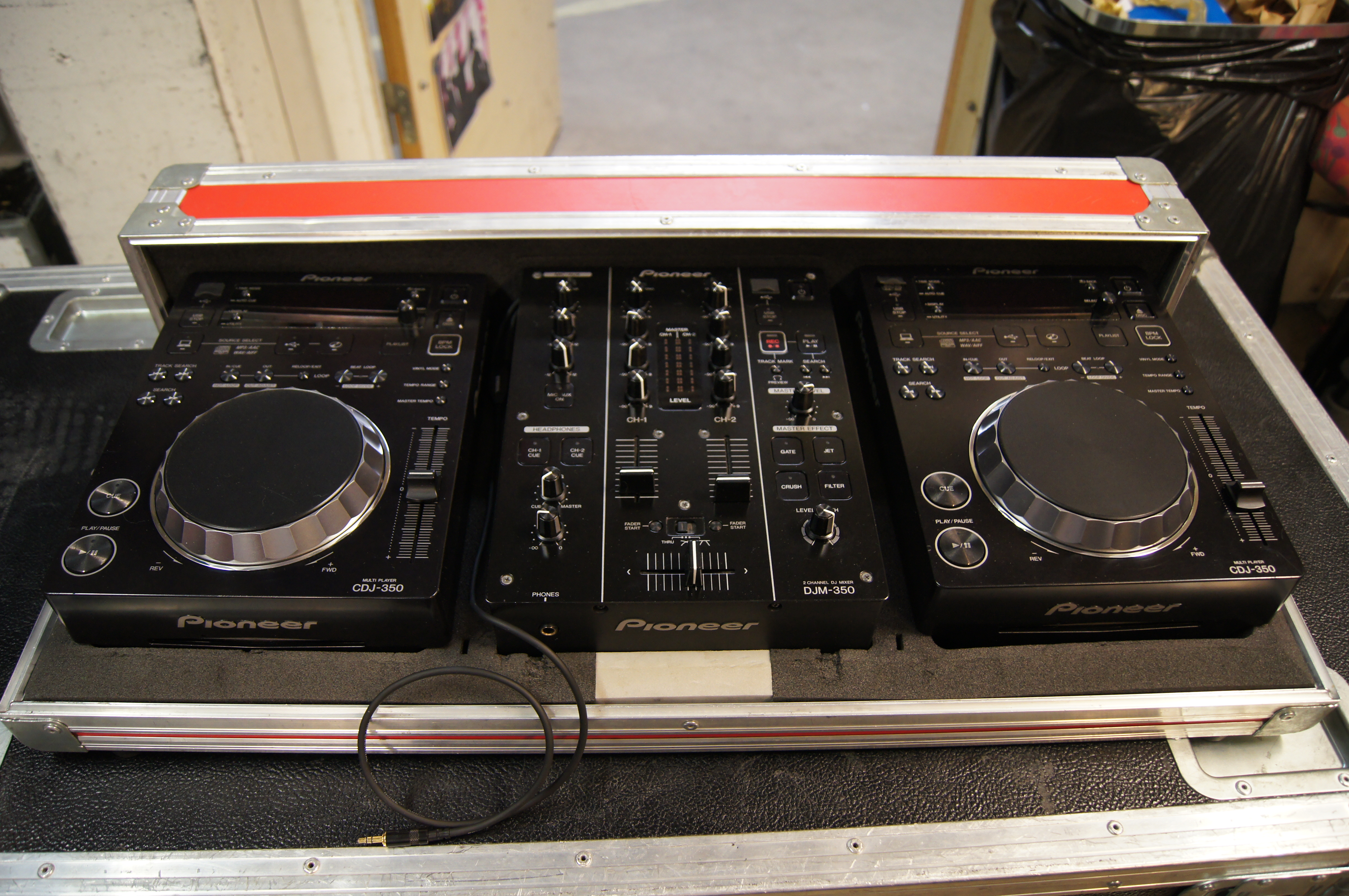Två CDJ-350 och en DJM-350 i rött Pioneer case. Sparsamt använt och i gott skick. Caset har xlr och powercon-uttag på baksidan med kablar dragna i caset. Original kabelgenomföring är övertejpad.