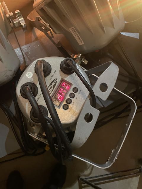 I kartong med laddsladd och DMX 5 till 5 vända.