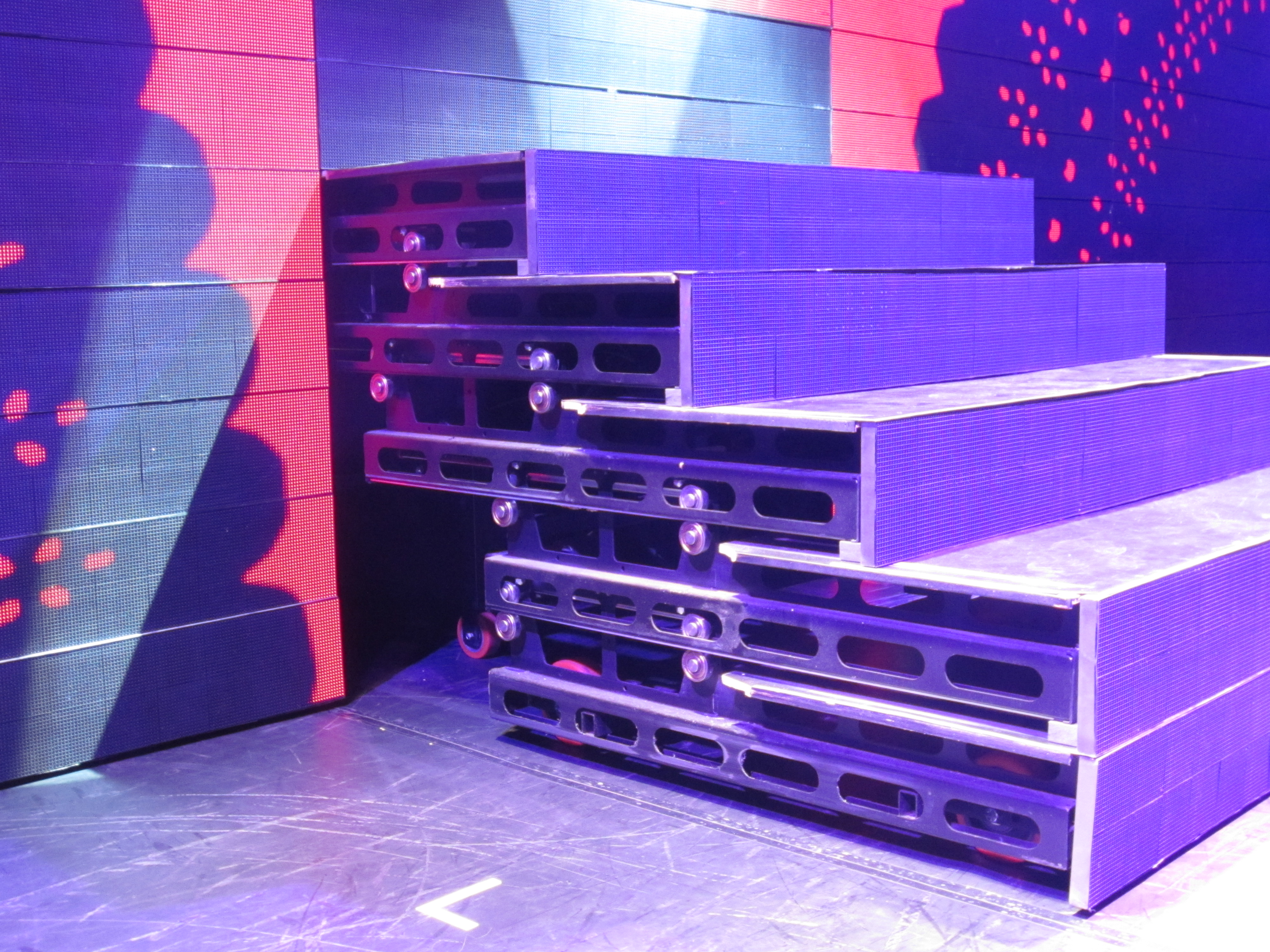 varje trappor innehållande 8st trappsteg, dessa är motoriserade och kontrollerat med dmx. Varje trapporna kan skjutas ut 600mm