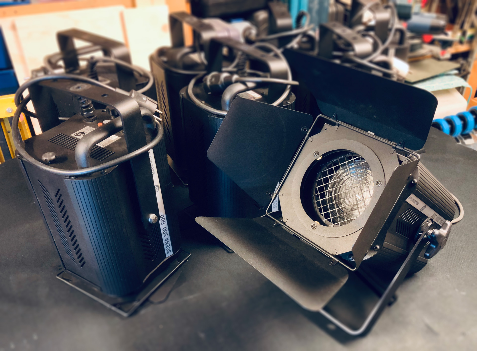 DTS Scena Fresnel med barndoor och fräsch glödampa. Nypris hos tysken 1200:- Pris 600:-/st eller 2200:- för 4 eller 4200:- för 8 +moms.
