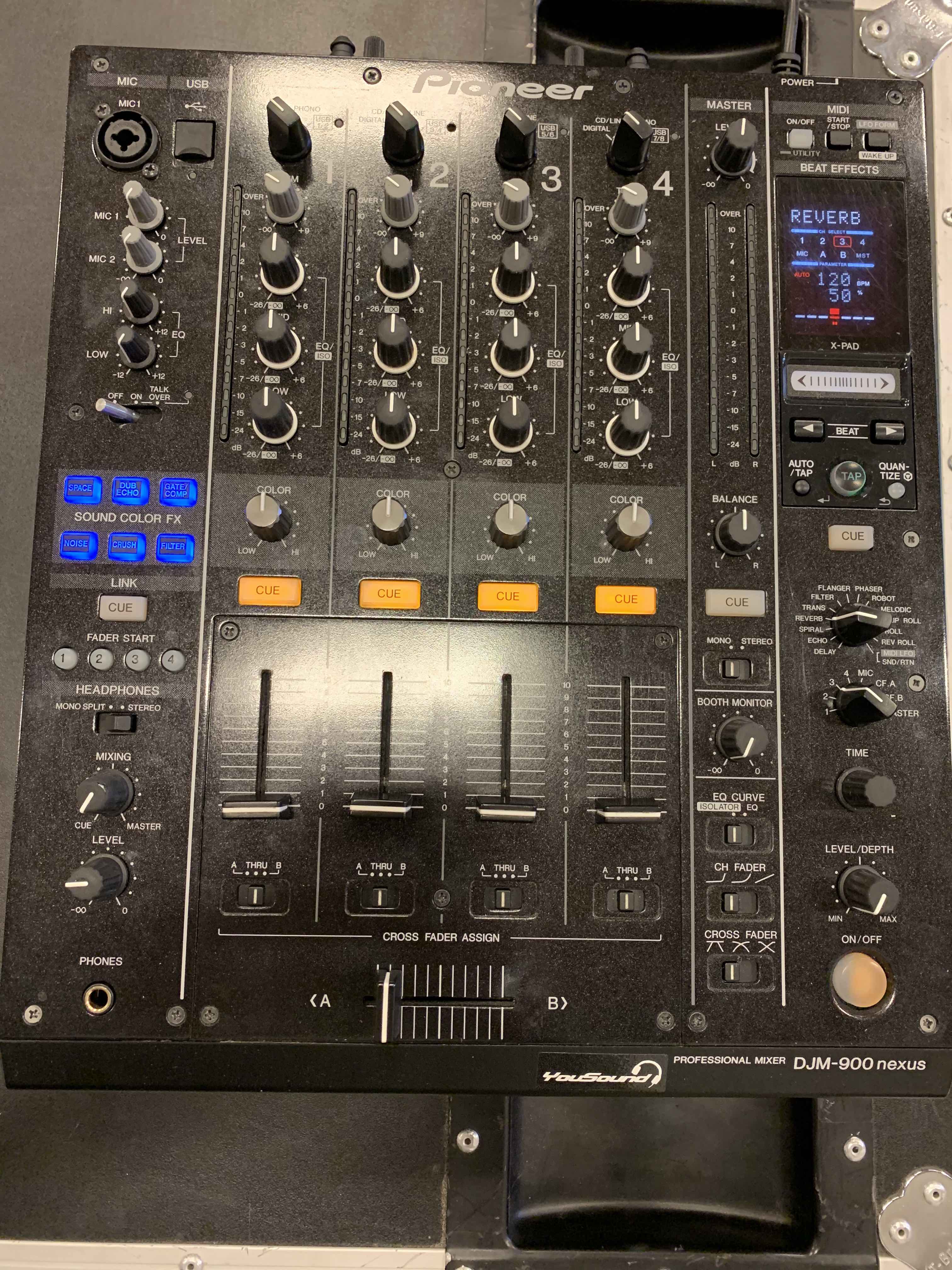 DJM-900NXS i väldigt fint skick estetiskt. Mixern har missljud från CD/Line-ingångarna på kanal 1 och 2 pga att CH1 och 2 för något år sedan blev ölsugna, MEN den fungerar utmärkt med digital-kabel.