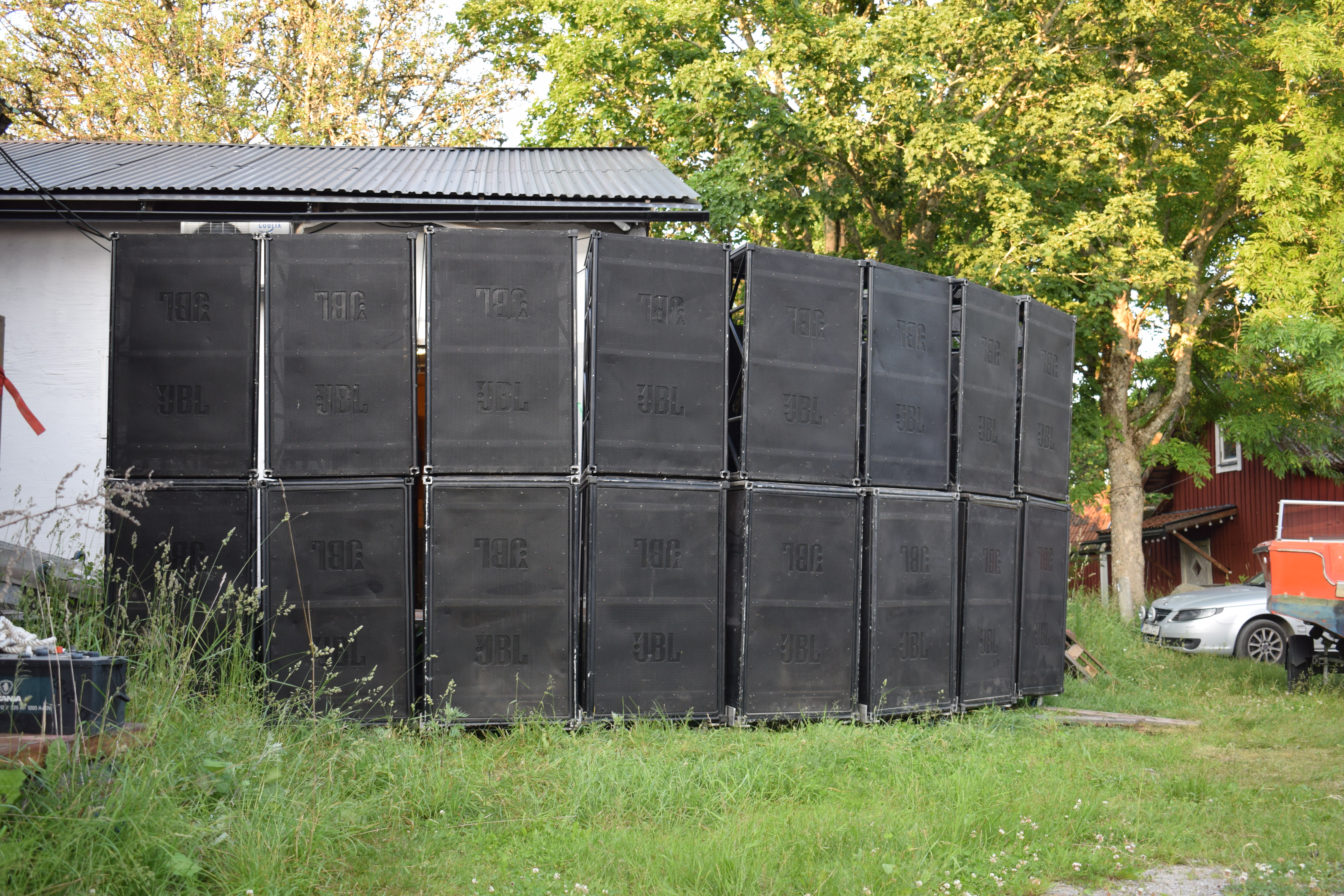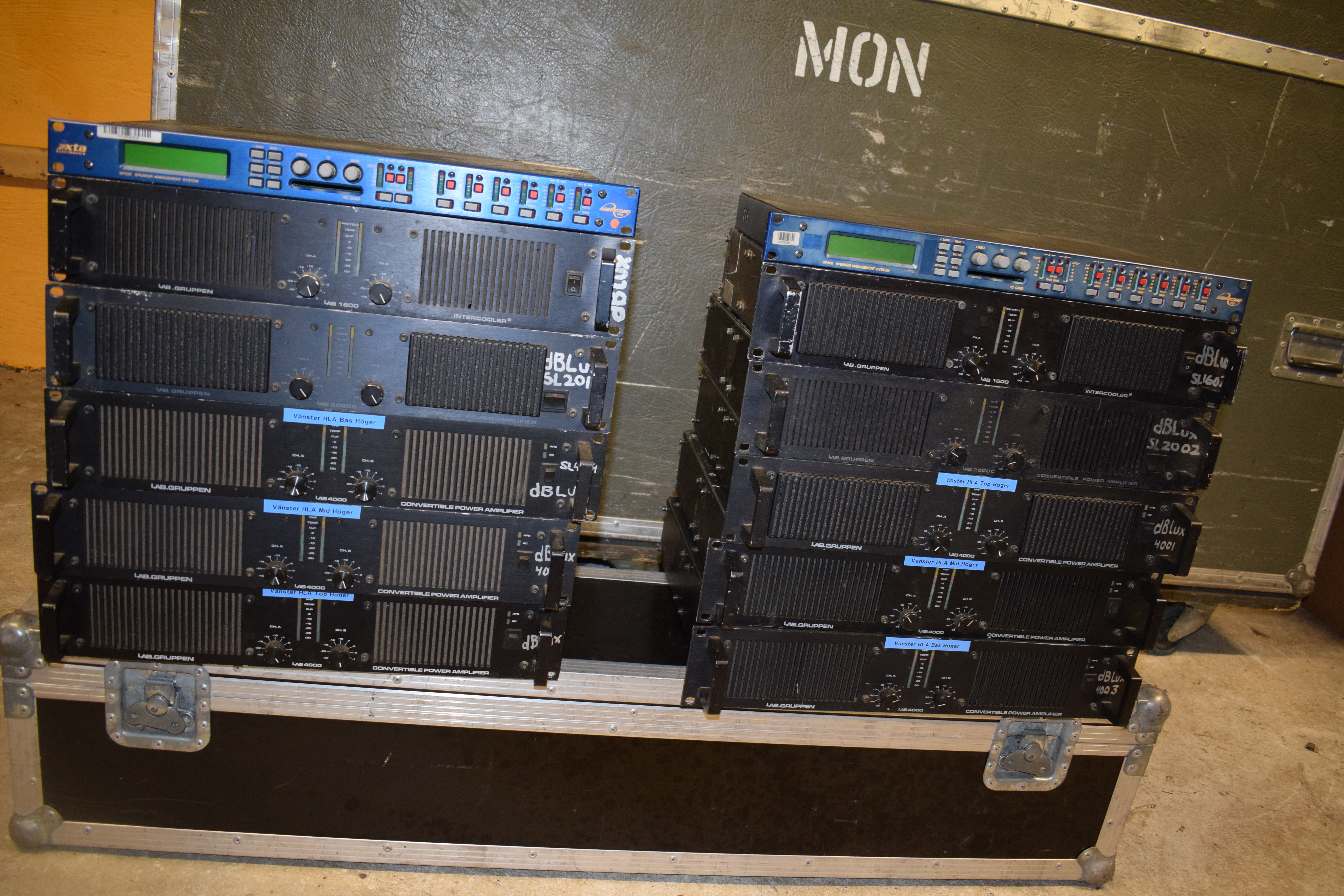 4xombyggda JBL HLA toppar + 4x d&B B2 subbasar + dBX processor/filter + 3x LAB steg + 2x d&b D12 steg