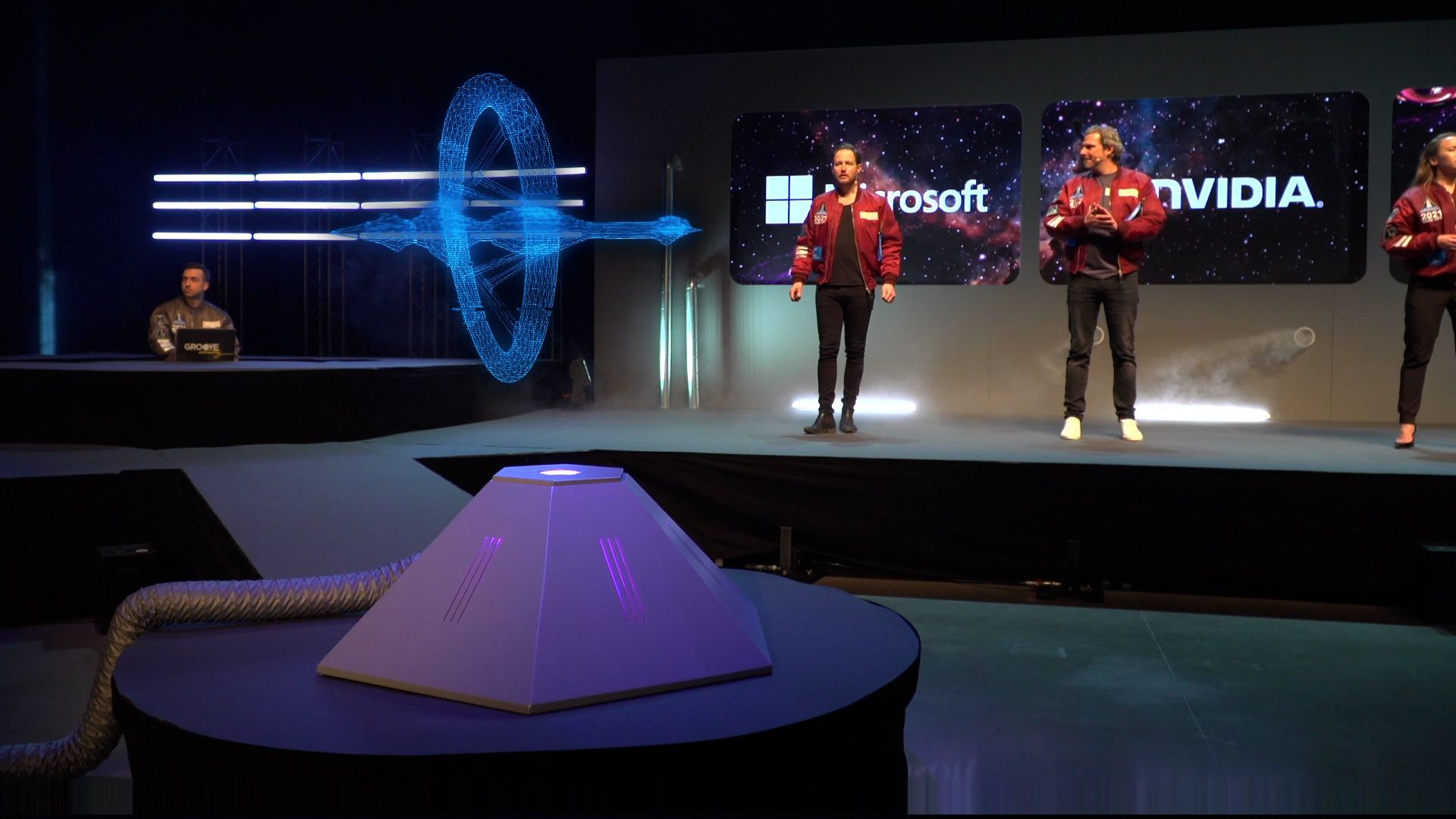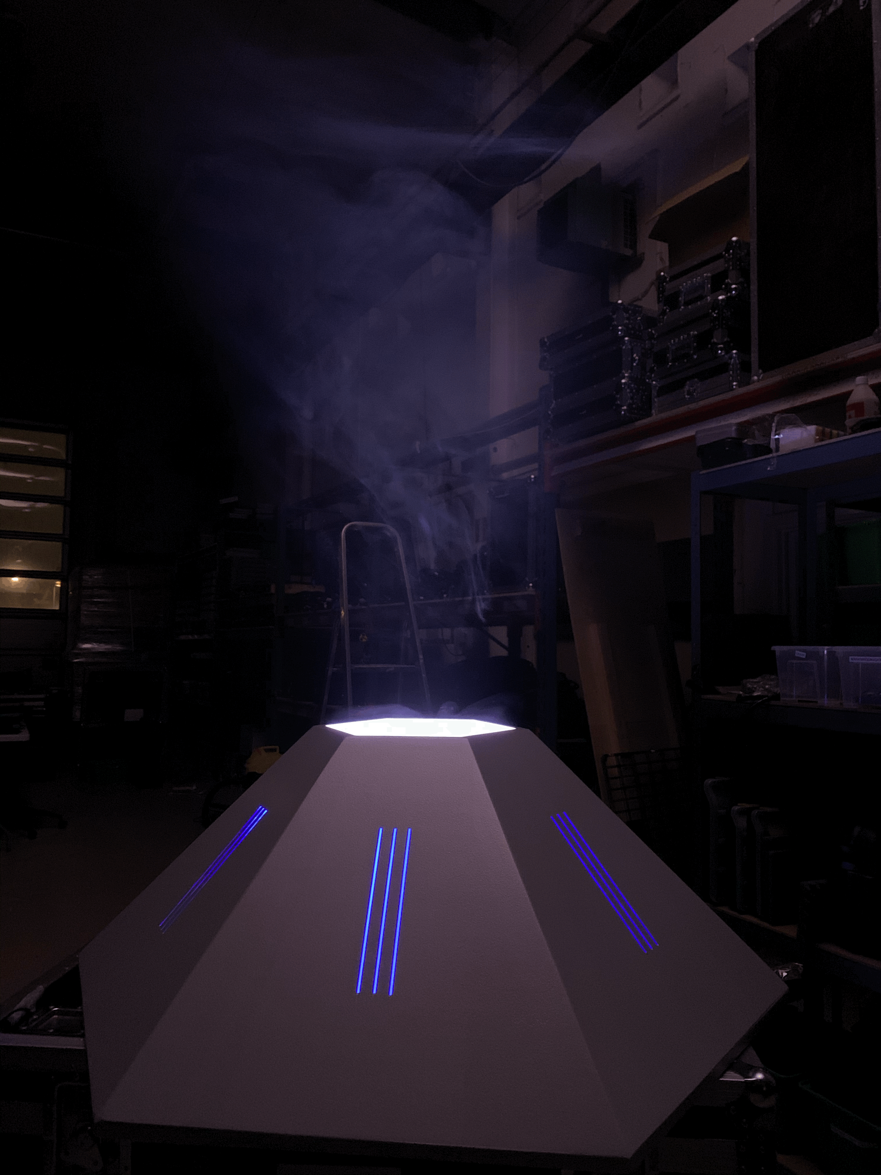 Nr2. "Podd" till samma rymdprojekt. Denna användes för att skapa ett hologram ur med hjälp av AR, och vi placerade ljus och rök inuti för att förstärka effekten i sändningen. 120cm i bredd nedtill. Mycket robust byggd av samma firma med en öppningsbar sida för att kunna rigga insidan. Målad i silverfärg.
