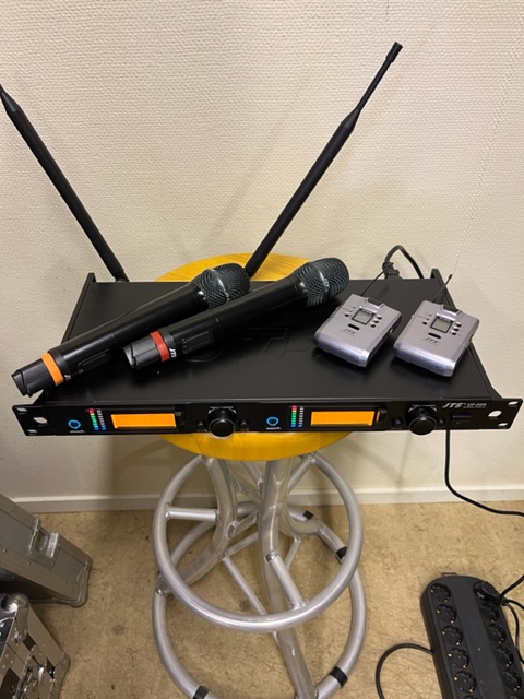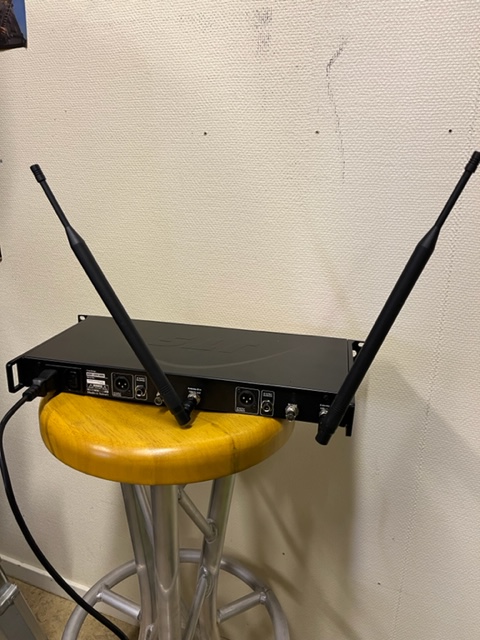 Trådlöst system med dubbelmottagare. 624 MHz - 694 MHz med två handsändare + två ficksändare. Handsändarna har utbytbar kapsel: sätt dit en Beta 58, kanske,,,.
