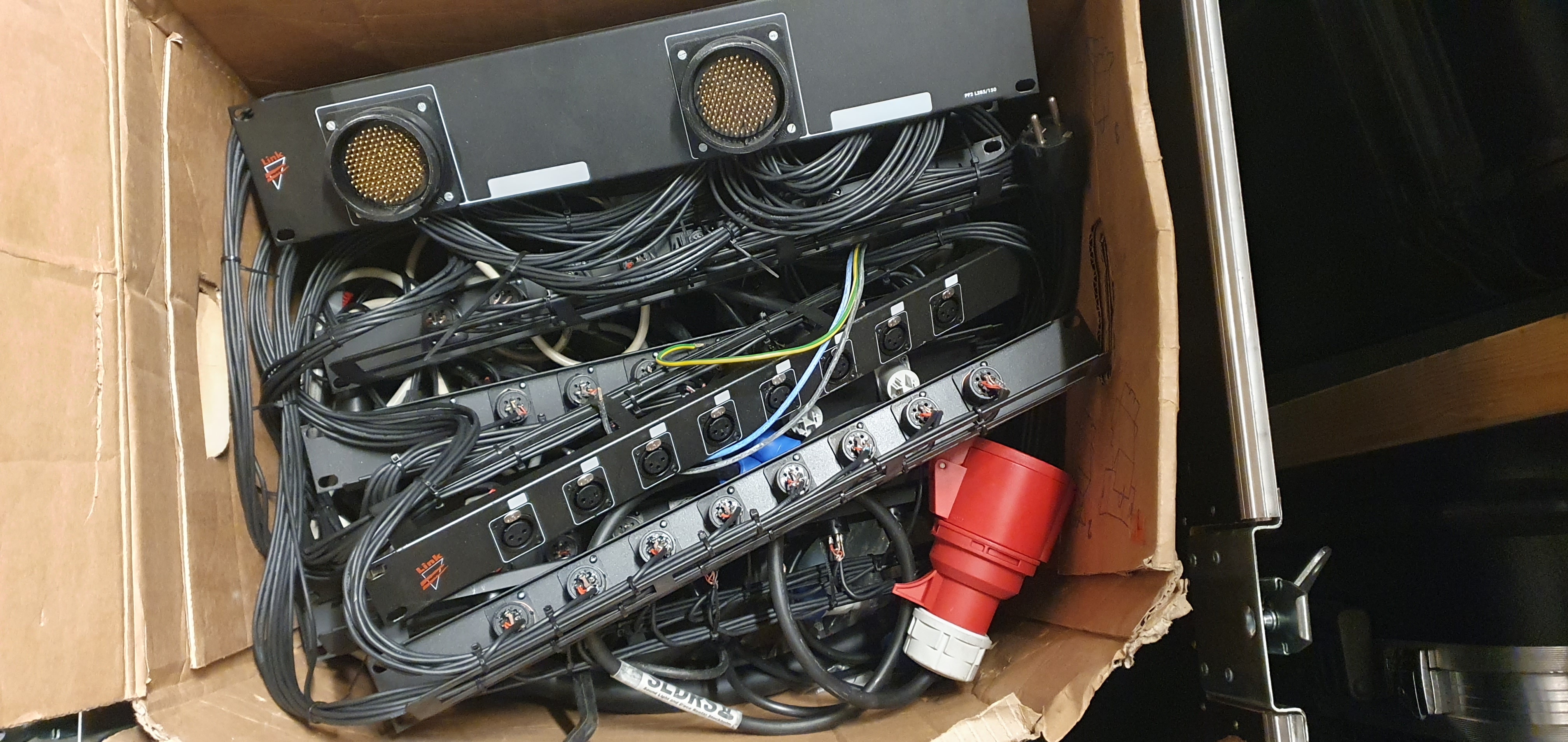 Finns mestadels 3-pol XLR (Neutrik), 1 st 63A intag, 16 /32 3-Fas kontakter, PowerCon Vita chassikontakter och ett gäng avklipta XLR kontakter olika fabrikat och både sladd och panelmontage (Några nya).