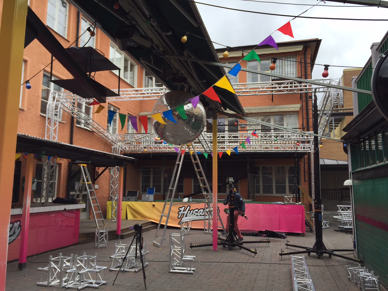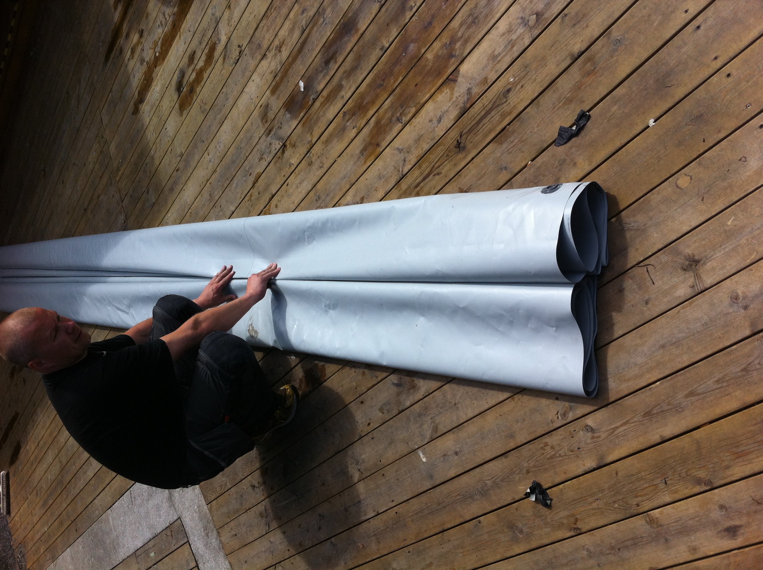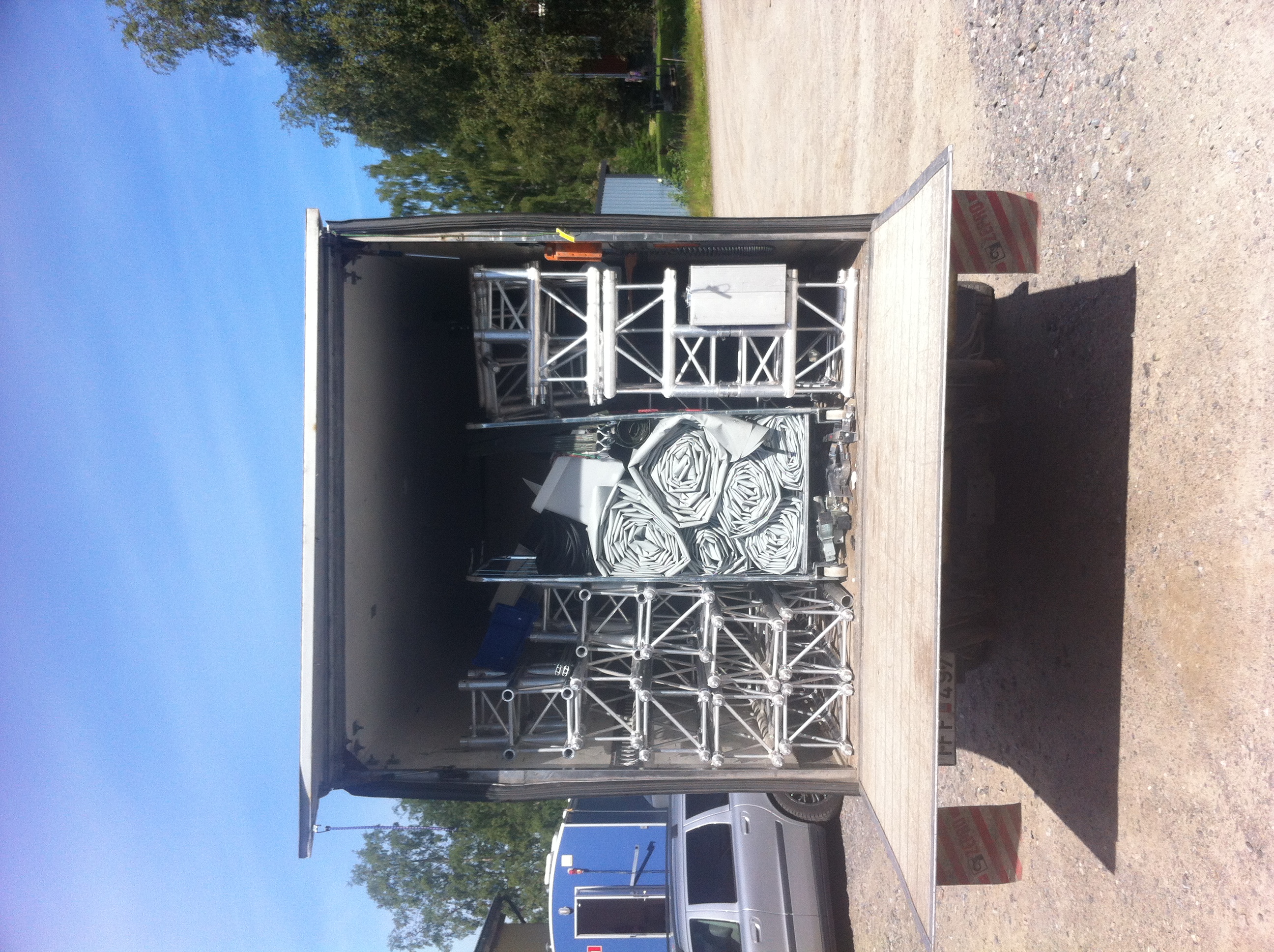 Det tar en full MB Sprinter med Tross och duk. Detta bygge är 12m bred 8m djup och jag tror 5m i framkant