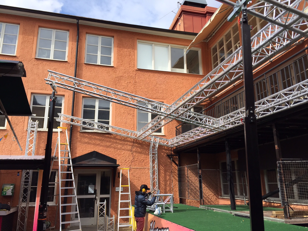 Fick också se bilder från tidigare byggare av samma tak, nämner inga namn. De hade dock valt att sätta bokhörn högst upp på samtliga ben, känns lite vågat på ett tak som är 9x5m som dessutom skall stå pall för att hänga PA och ljus i taket. Men det va ingen som dog förra året