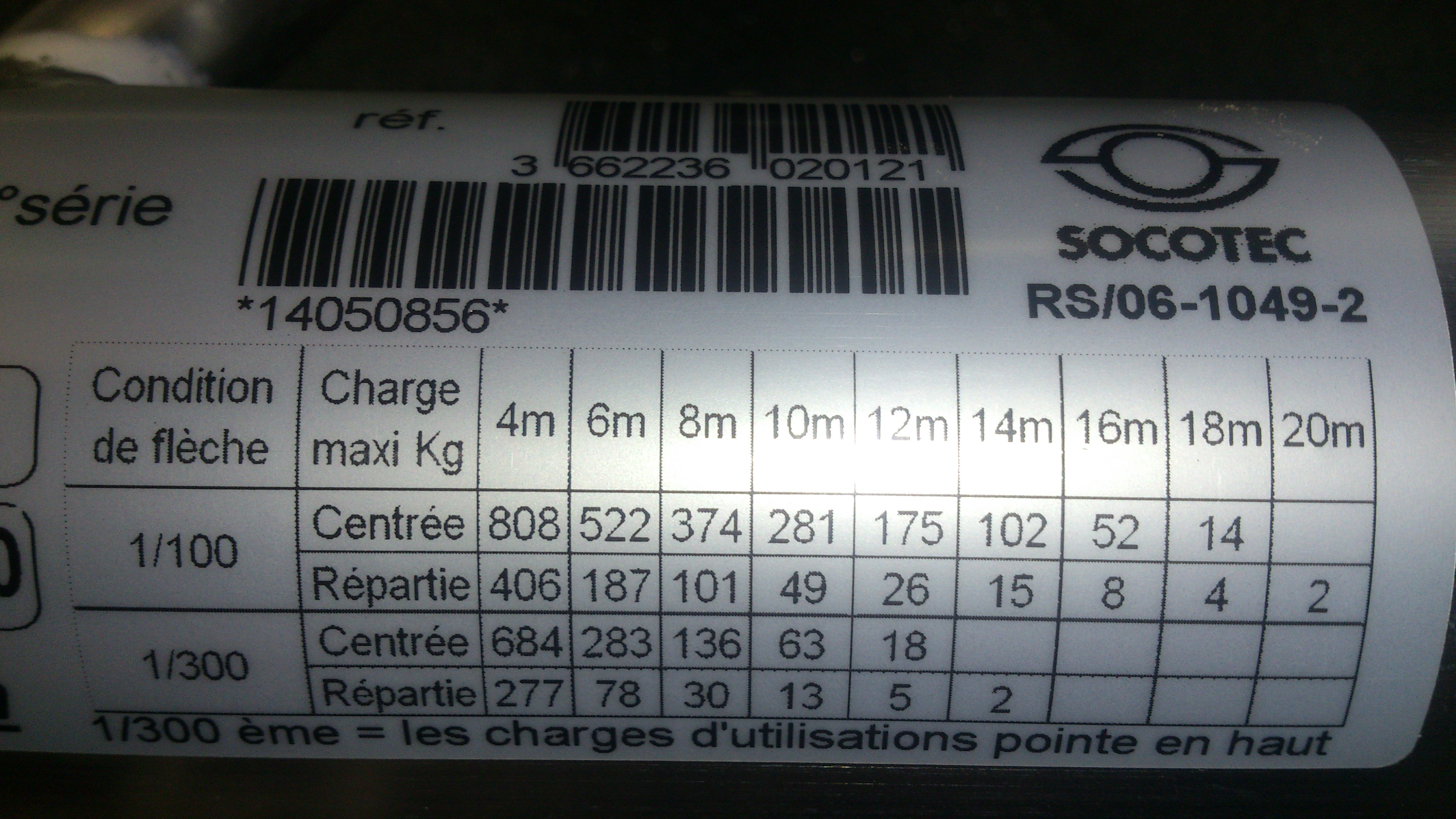 Med högst begränsade kunskaper i franska och utan att se mer av trossen så verkar det ändå vara en trekantstross där den nedre tabellen (1/300) visar max last när trossen "pekar uppåt", vilket stämmer med de flesta specar jag sett där "apex up" brukar klara mer last än tvärtom (kan vara samma åt båda hållen hos en del tillverkare, men jag har nog aldrig sett tvärtom).